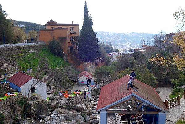 當地洗衣服的地方 , 頑皮的孩子爬到屋頂上玩